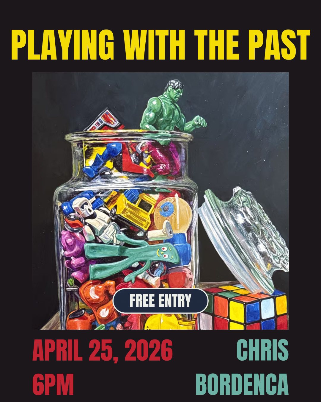 Chris is a painter whose work explores personal connections to the objects and places of his youth in the 1970s and 1980s. His paintings often draw from the visual world of action figures, toys, and classic video games, turning familiar images into thoughtful, nostalgic works of art. Chris has exhibited throughout New England in both solo and group shows, and several of his paintings have received awards, including Pink Pony Club, which won First Place for acrylic painting at the Northeast Fine Arts Exposition in 2025.